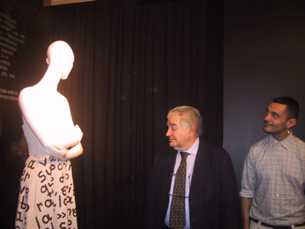 La exposición mostró los trajes realizados por doce relevantes diseñadores españoles, que interpretaron de forma personal, a su vez, doce textos de la mejor literatura española e hispanoamericana. De tal forma que creadores como Ágatha Ruiz de la Prada, Ailanto, Alma Aguilar, Amaya Arzuaga… se unieron así a autores como Gabriel García Márquez, Miguel Delibes o Carmen Martín Gaite. Al diseñador David Delfín le tocó inspirarse en un poema de Antonio Gamoneda. Y desde una óptica diferente, a través de un sencillo vestido en color crudo, con escote palabra de honor y estampado con letras, se produjo esta interacción entre el arte de Delfín y Gamoneda, ambos presentes en la inauguración y mutuamente sorprendidos. No se conocían personalmente, y esto fue lo que ocurrió: