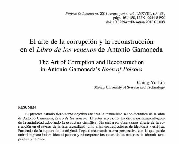 La profesora Ching-Yu Lin, de la Macau University of Science and Technology (China), profundiza en el «Libro de los venenos», de Antonio Gamoneda, en un ensayo de 180 páginas. Se puede leer y/o descargar desde este enlace.