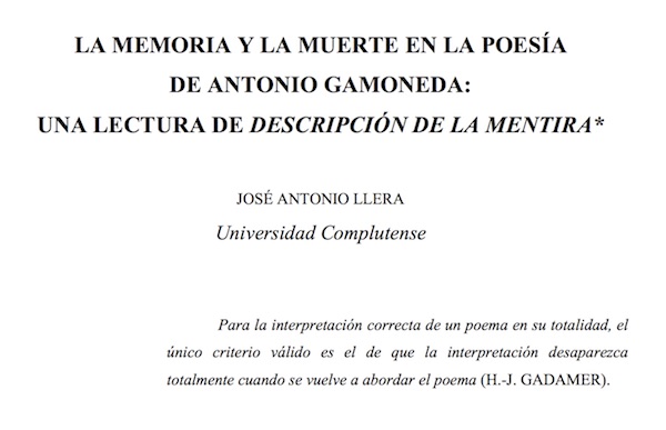 Una lectura de «Descripción de la mentira», por José Antonio Llera (2002) Haz un click en la imagen para leer o descargar el artículo en pdf. — — — «LA MEMORIA Y LA MUERTE EN LA POESÍA DE ANTONIO GAMONEDA: UNA LECTURA DE DESCRIPCIÓN DE LA MENTIRA» Artículo de JOSÉ ANTONIO LLERA publicado originalmente en Laurel. Revista de Filología (núm. 5, 2002, pp. 25-61). Comparte esto: Haz clic para enviar un enlace por correo electrónico a un amigo (Se abre en una ventana nueva) Correo electrónico Haz clic para compartir en X (Se abre en una ventana nueva) X Haz clic para compartir en Facebook (Se abre en una ventana nueva) Facebook Me gusta Cargando... Relacionado