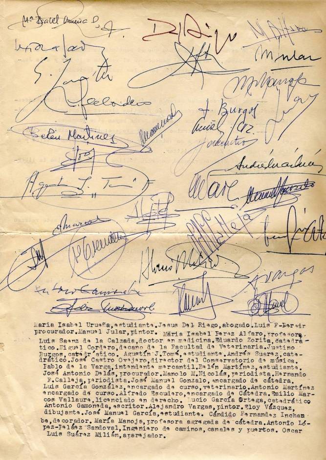 1 folio 1 firmas 1969 Siguiente → Folio 1 de 7. Miguel Cordero del Campillo y Antonio Gamoneda, entre los firmantes.