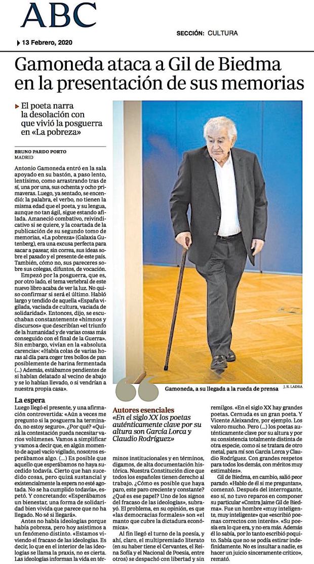 La noticia de la presentación de «La pobreza», segundo tomo de las memorias de Antonio Gamoneda, en un artículo de BRUNO PARDO PORTO publicado en el diario ABC (13 febrero 2020).