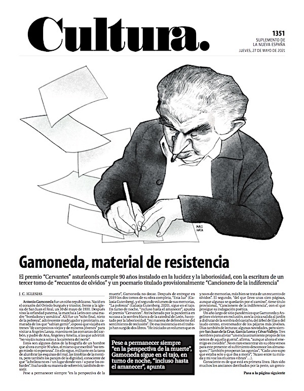 Pese a permanecer siempre “en la perspectiva de la muerte”, Gamoneda no decae. Después de entregar en 2019 los dos tomos de su obra completa, “Esta luz” (Galaxia Gutenberg), y el segundo volumen de sus memorias, “La pobreza” (Galaxia Gutenberg, 2020), sigue en el tajo. En turno de noche, “incluso hasta el amanecer”, apunta el premio “Cervantes”. Atrincherado por la pandemia en su casa a la sombra blanca de la catedral de León, ha optado por la laboriosidad, “mi manera de defenderme del sentimiento de reclusión”. De esa insistencia en el trabajo han surgido dos libros. “He iniciado un volumen que es y no es de memorias, más bien se trata de un recuento de olvidos”. El segundo, “del que llevo unas cien páginas, aunque algunas se quedarán por el camino”, tiene titulo provisional, “Cancionero de la indiferencia”, con el que prosigue su indagación poética.