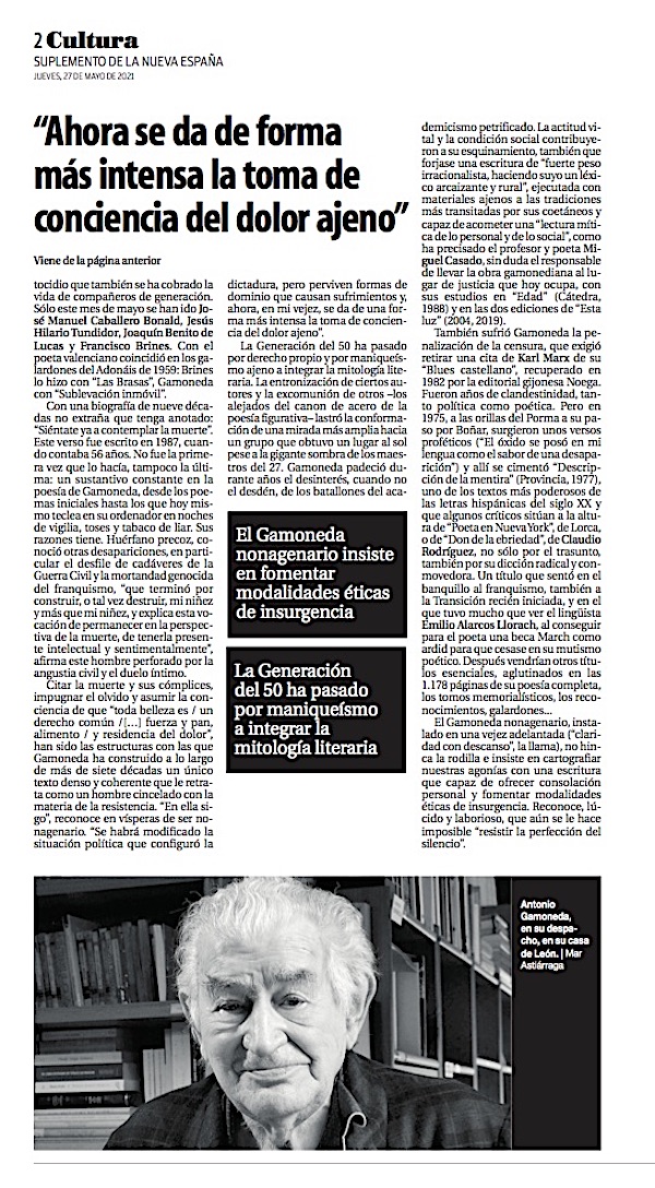 Consciente es de que está en primera línea. Han sido muchos los ancianos derribados por la peste, un gerontocidio que también se ha cobrado la vida de compañeros de generación. Sólo este mes de mayo se han ido José Manuel Caballero Bonald, Jesús Hilario Tundidor, Joaquín Benito de Lucas y Francisco Brines. Con el poeta valenciano coincidió en los galardones del Adonáis de 1959: Brines lo hizo con “Las Brasas”, Gamoneda con “Sublevación inmóvil”.