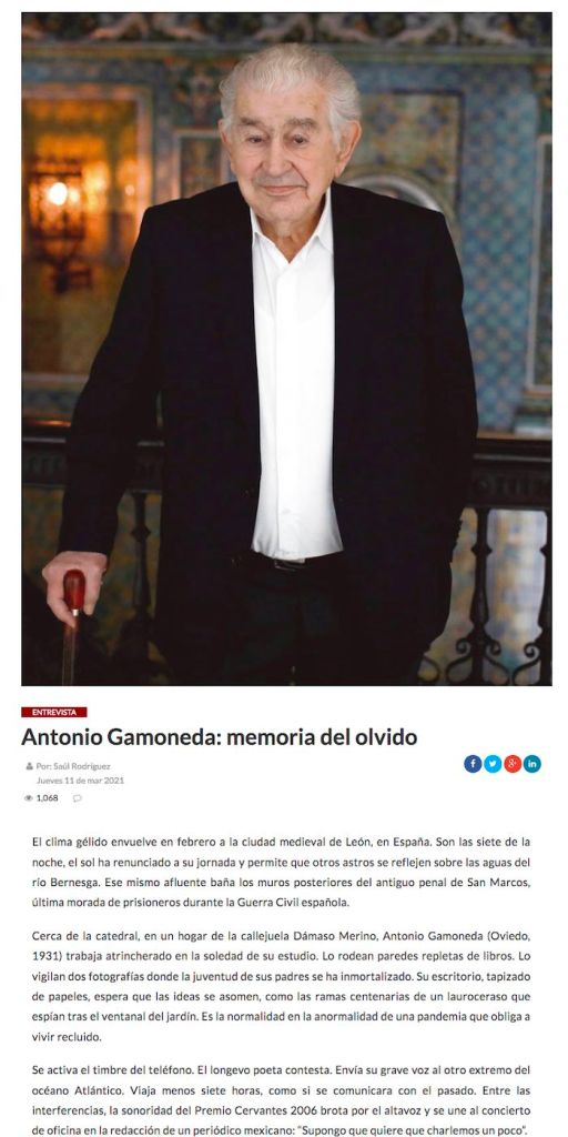 Entrevista con Gamoneda en ‘Siglo Nuevo’ (México) Saúl Rodríguez entrevistó a Gamoneda desde México para la revista digital Siglo Nuevo. Haz un click para leer la entrevista… Comparte esto: Enviar un enlace a un amigo por correo electrónico (Se abre en una ventana nueva) Correo electrónico Compartir en X (Se abre en una ventana nueva) X Comparte en Facebook (Se abre en una ventana nueva) Facebook Me gusta Cargando... Relacionado