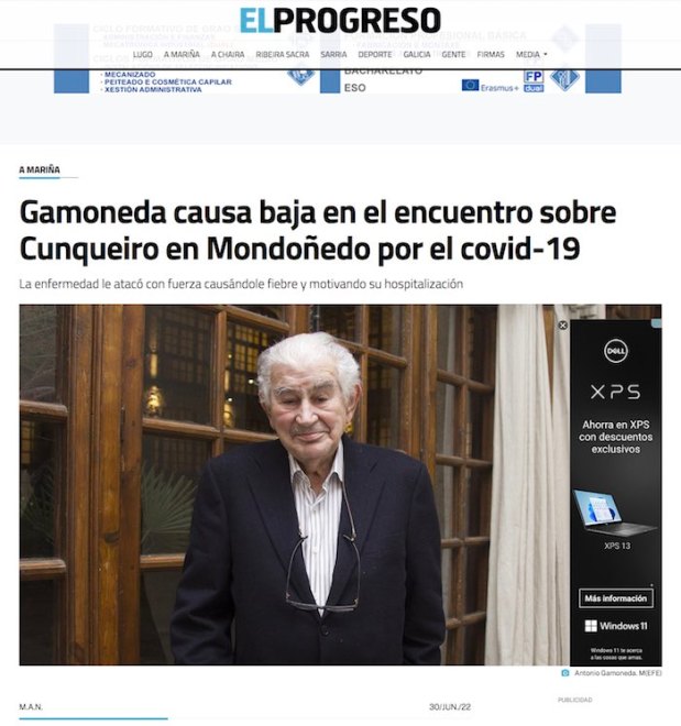 El poeta Antonio Gamoneda se encuentra hospitalizado tras contraer el covid-19, razón por la que no podrá acudir al encuentro sobre la figura de Álvaro Cunqueiro que se desarrollará este primer fin de semana de julio en la ciudad gallega de Mondoñedo bajo la forma de curso de verano de la USC.