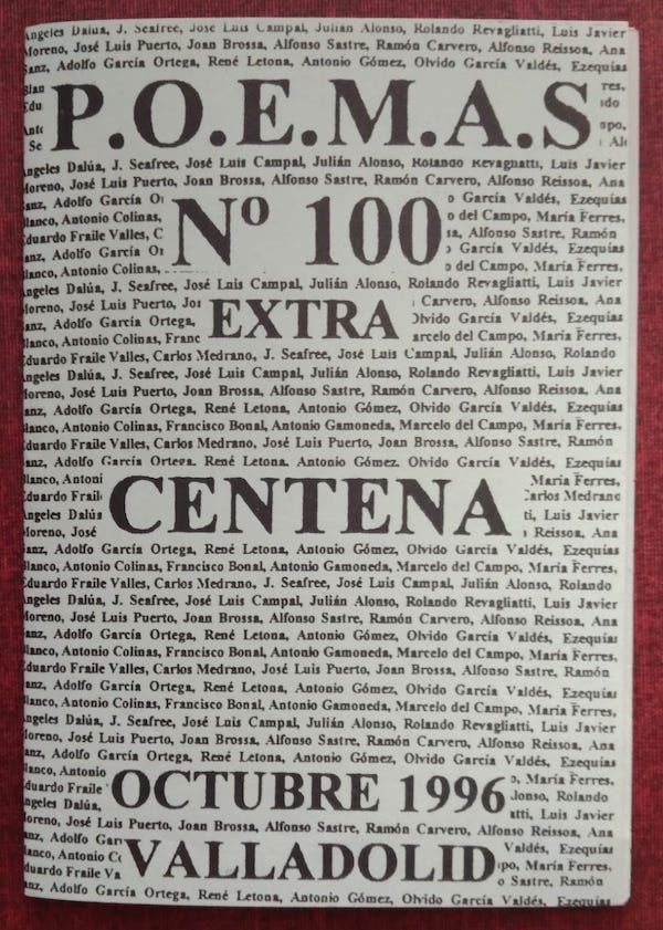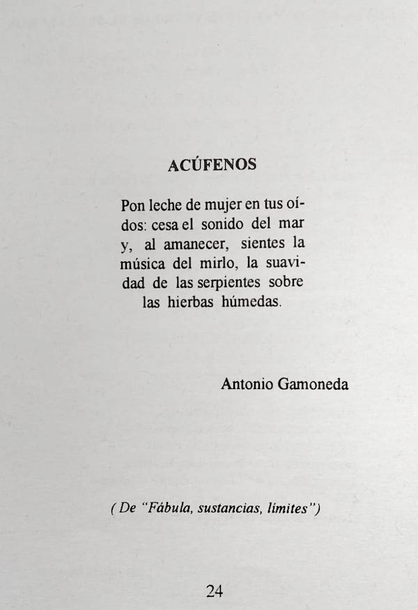 «Acúfenos», un poema de Antonio Gamoneda en el nº 100 de la revista P.O.E.M.A.S. (Proyectos Originales. Ediciones Marginales. Anómala Sociedad), que editaba el poeta visual Rafael Marín en Valladolid, correspondiente a octubre de 1996.