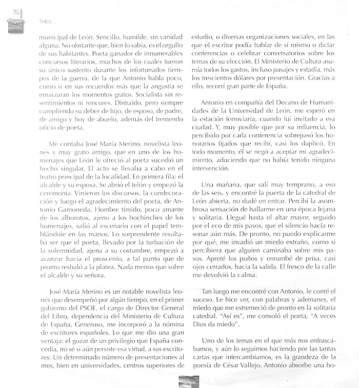 El escritor peruano Jorge Díaz Herrera publicó este artículo, titulado «Antonio Gamoneda, la constancia de la amistad», en el Nº 21 de la revista Trilce (Chile, junio 2008), pág. 35-37.