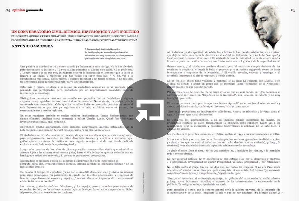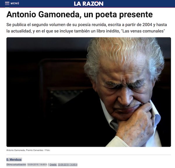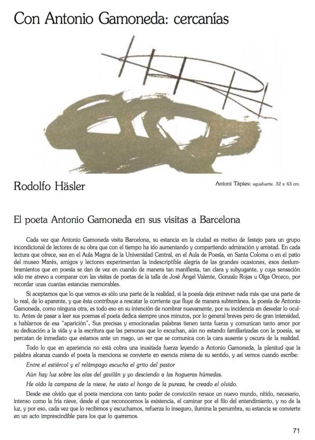 Como la mayoría de los lectores de mi generación, descubrí el mundo poético de Gamoneda gracias a Edad (1987), la edición realizada por Miguel Casado para Cátedra donde reunía poemas escritos entre 1947 y 1986. Con ese libro, Gamoneda pasó de ser un perfecto desconocido, o casi, a conseguir el favor de los lectores y de la crítica. Al año siguiente obtuvo el Premio Nacional, inequívoco anticipo de los numerosos e importantes galardones que han venido después, incluido el Cervantes.