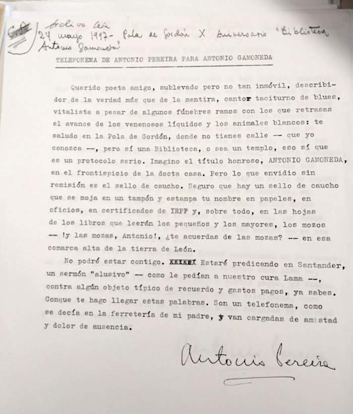 Diez años después, el 24 de mayo de 1997, su amigo Antonio Pereira le envió este mensaje para celebrar el décimo aniversario de la biblioteca, al que no pudo asistir: