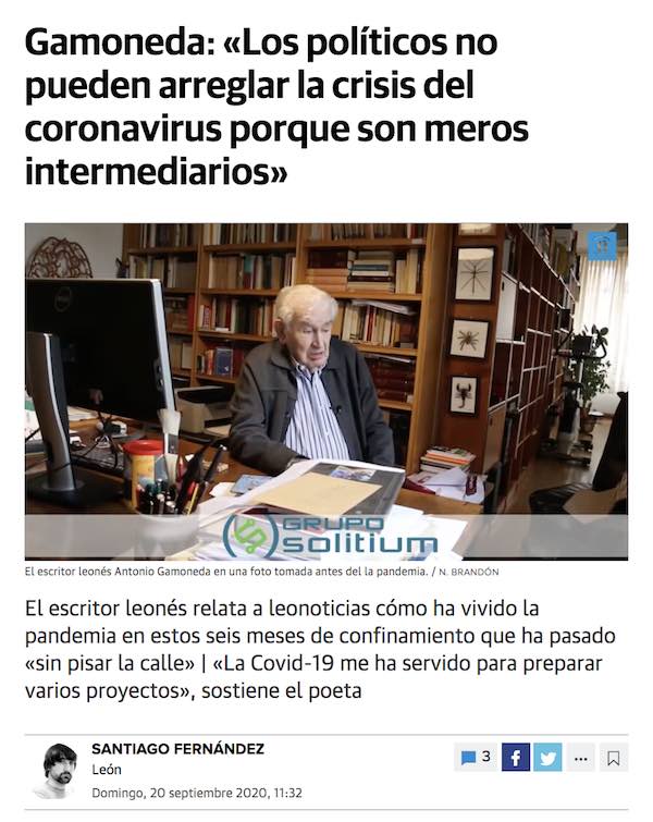 La revista digital Tendencias21 reproduce en su sección Tendencias Literarias una entrevista con Antonio Gamoneda, realizada por Javier Gil Martín., publicada con anterioridad en el número 144 (septiembre-octubre 2020) de la revista adiós (revistaadios.es).