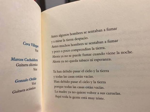 Al final, la cantante Cova Villegas interpretó para Gamoneda algunas canciones asturianas aprendidas de su abuelo, acompañada al clarinete bajo por su marido, el poeta y músico Ildefonso Rodríguez. El acto finalizó con una impresión de las manos de Gamoneda en una sustancia parecida al barro, que llevó a cabo el artista Alejandro Sáenz de Miera.