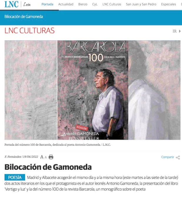 POESÍA / Madrid y Albacete acogerán el mismo día y a la misma hora (este martes [21 de junio de 2022], a las siete de la tarde) dos actos literarios en los que el protagonista es el autor leonés Antonio Gamoneda: la presentación del libro ‘Vertigo y luz’ y la del número 100 de la revista Barcarola, un monográfico sobre el poeta.