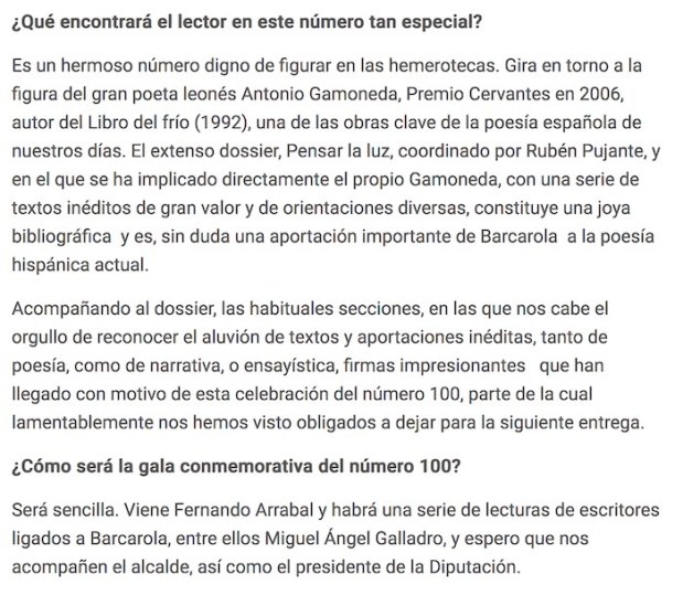No se pueden entender los 50 últimos años de la literatura española, y aún europea, sin el concurso de Barcarola, nacida en 1979, en Albacete, en el seno de un grupo de profesores entusiastas, y que, merced a una serie de apoyos, fue ampliando su círculo mágico hasta convertirse en lo que es hoy: una auténtica joya, con dossiers consagrados a autores esenciales (los últimos, concretamente, a Julio Cortázar, Muñoz Molina, Apollinaire, Ángel Crespo y Enrique Vila-Matas), que nos han permitido acceder a las grandes Universidades, Bibliotecas y colegios del mundo entero.