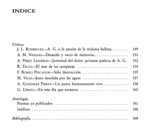 Aquí reproducimos el índice de contenidos del número dedicado a Antonio Gamoneda, con textos críticos de José Luis Rodríguez García, Antonio Pérez Lasheras, Félix Romeo Pescador y Ángel González Pieras, y, alternándose con ellos, poemas dedicados a Gamoneda escritos por Ana María Navales, Rosendo Tello, Manuel Vilas y Guillermo Urbizu.
