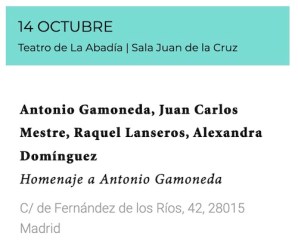 El acto inaugural del festival se celebrará el 14 de octubre en el Teatro de La Abadía (Madrid), donde a las 19 horas se rendirá un homenaje a Antonio Gamoneda de la mano de tres deudores y herederos del gran poeta español: Juan Carlos Mestre, Alexandra Jiménez y Raquel Lanseros.