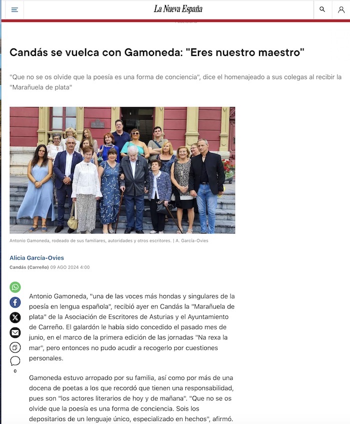 Aprovechando sus vacaciones en una casa familiar cercana a Luarca, el poeta Antonio Gamoneda acudió el pasado 8 de agosto a recoger personalmente, en la localidad de Candás, la «Marañuela de plata» que le concedió hace unos meses la Asociación de Escritores de Asturias.