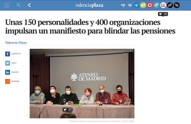 El manifiesto también resalta que el Sistema Público de Pensiones es un «pilar» de la cohesión social, es la «principal fuente de justicia e igualdad», y debe garantizar las condiciones de vida de la mayoría, tanto en el presente como en el futuro. «Hay que protegerlo y reforzarlo», subrayan.