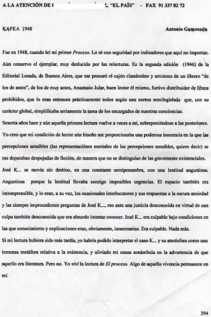 [* Nota de E. Otero: Esta hoja apareció hace unos días, entre papeles de Antonio Gamoneda, con un encabezado dirigido a C. R., redactor de El País. El poeta, a mis preguntas, dijo no recordar la fecha o el año en que lo envió por fax al periódico, y si se publicó o no. No hemos hallado referencia a este texto en la hemeroteca digital del periódico. Parece un pequeño apoyo preparado para acompañar, como un pequeño suelto, o junto a textos de distintos autores, una reseña más grande a propósito de alguna edición relacionada con Franz Kafka (1883-1924), tal vez publicada en papel en el Babelia. El folio firmado por Gamoneda lleva el número 294, por lo que quizá fuera reciclado, o entresacado de un original más grande. El nº de fax es indicativo de que este texto se envió cuando el correo electrónico o no existía o su uso no estaba normalizado.]
