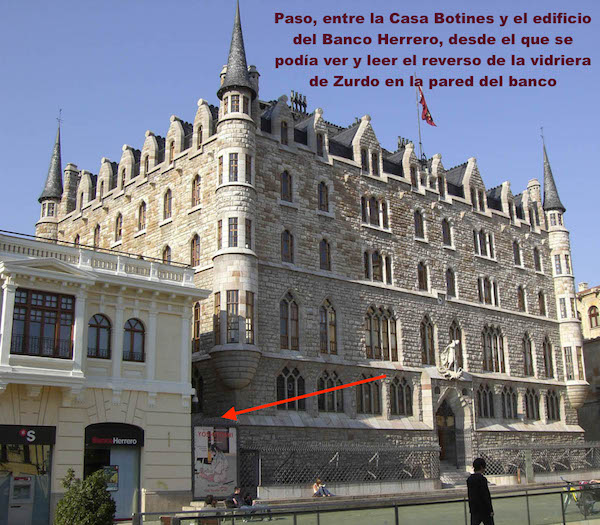 Entre la Casa de Botines y el Banco Herrero hay un pequeño pasillo empedrado. Cuando la verja esta abierta, si se entra ahí, se pueden leer unas palabras del revés (forman parte de una vidriera), inscritas sobre el edificio bancario: “La luz es para todos los hombres. / También la tierra lo será algún día. / Si tu pensamiento es libre como la luz / que tus manos sean generosas como la tierra”. De vez en cuando estos versos saltan a las redes sociales, sin que nadie sepa decir a quién pertenecen. Pues bien, son versos de