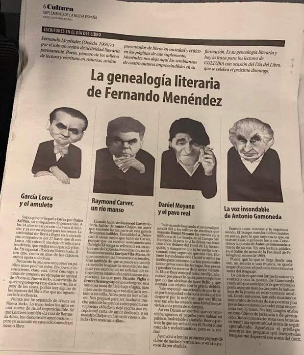 Con motivo del próximo Día del Libro, el escritor y poeta asturiano Fernando Menéndez (Oviedo, 1966) presenta su genealogía literaria en una página del diario La Nueva España (20 de abril de 2023), en la que incluye al poeta astur-leonés Antonio Gamoneda.