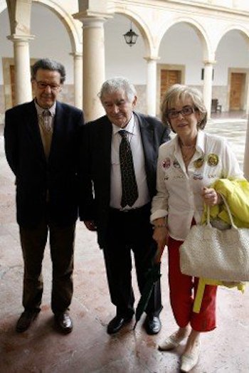 Gamoneda, en el centro, junto a la profesora Josefina Martínez y el pensador Moisés Mori, en el claustro de la Universidad de Oviedo, el día (15-06-2009) de la presentación de su libro de memorias en su ciudad natal.