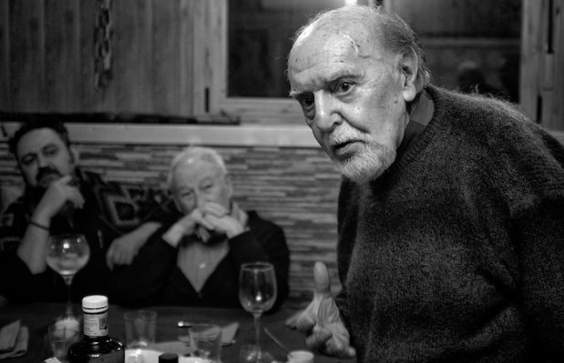 Pablo de la Varga en una fotografía de José Ramón Vega. Al fondo, los pintores José de León y Alejandro Vargas.
