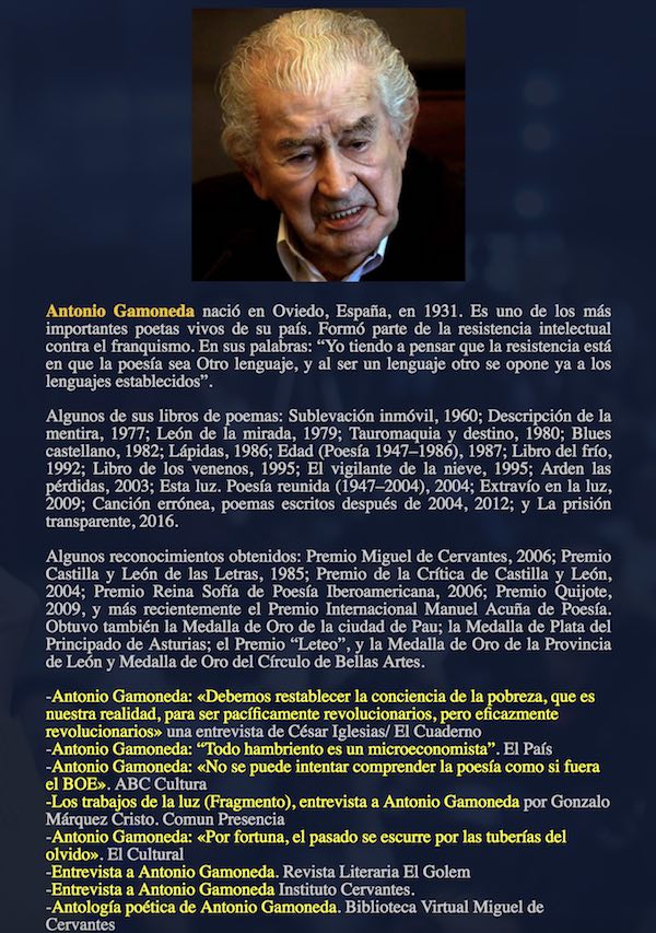 Antonio Gamoneda es uno de los más importantes poetas vivos de su país. Formó parte de la resistencia intelectual contra el franquismo. Premio Miguel de Cervantes, 2006; Premio Reina Sofía de Poesía Iberoamericana, 2006.
