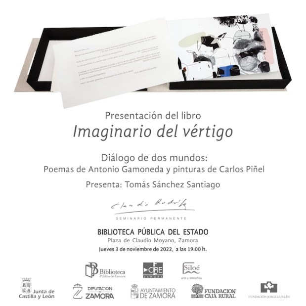 El jueves 3 de noviembre a las 19:00 horas, en la Biblioteca Pública del Estado en Zamora, tendrá lugar la presentación del libro conjunto Imaginario del vértigo. Diálogo de dos mundos: poemas de Antonio Gamoneda y pinturas de Carlos Piñel, con una charla entre el Premio Cervantes y el ilustrador de la obra.
