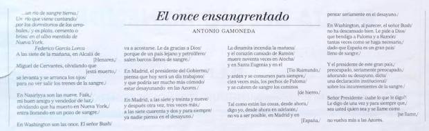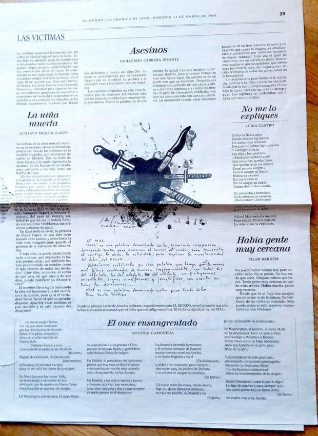 [Este poema de Antonio Gamoneda apareció publicado en la edición nacional del diario El Mundo, y en sus distintas ediciones locales y regionales, el domingo 14 de marzo de 2004, tres días después de que diez bombas estallaran de forma casi simultánea, pasadas las 7:30 horas de la mañana, en cuatro trenes de la red de Cercanías de Madrid, en un atentado devastador llevado a cabo por una célula yihadista (como revelaron las posteriores investigaciones) que dejó 191 muertos y unos 2.000 heridos.]