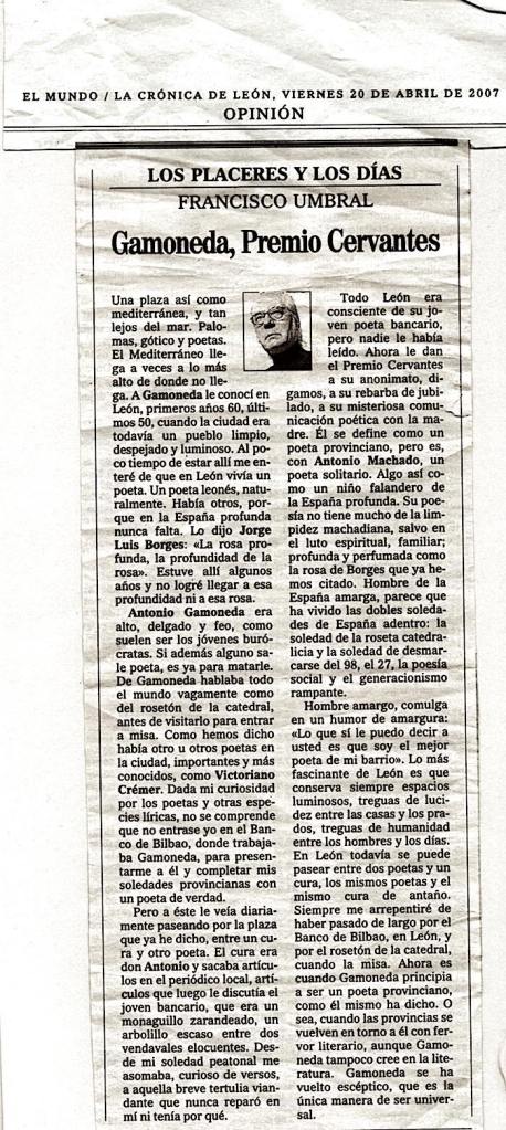 Un viejo artículo de Francisco Umbral, sobre la concesión del Premio Cervantes al poeta Antonio Gamoneda. Publicado en el diario El Mundo (el recorte es de La Crónica-El Mundo, viernes 20 de abril de 2007).