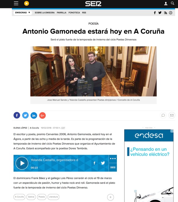 En el mes de febrero de 2018, en concreto el día 19, a las 20,30 horas, se darán cita dos voces «llenas de depuración en su estilo literario» de la poesía gallega y española: Dores Tembrás y Antonio Gamoneda.